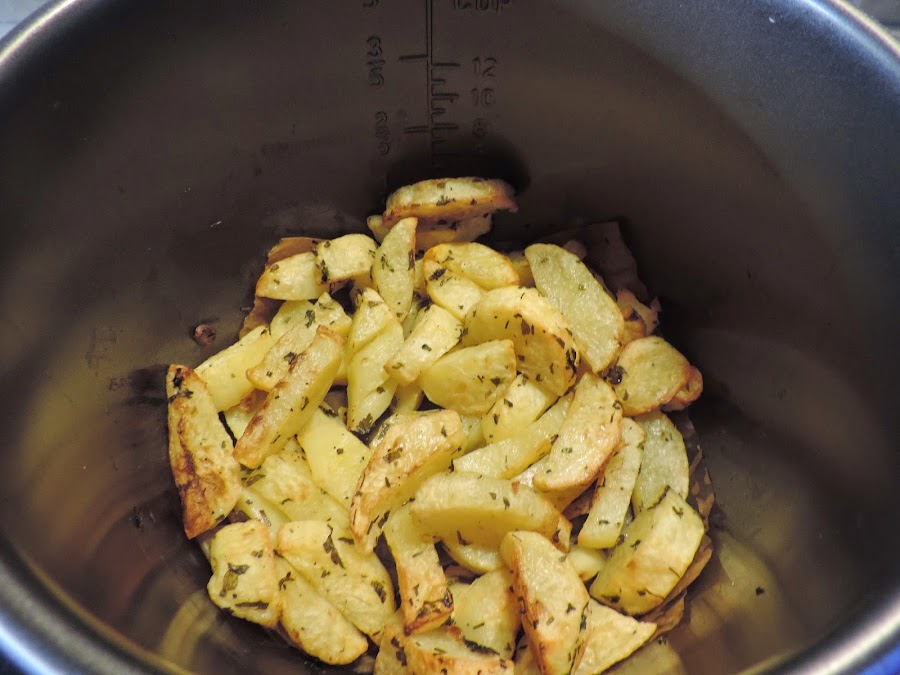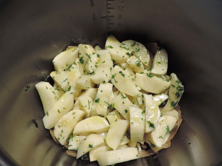 Las ponemos en la cubeta de la olla con los ajos fileteados, perejil picado, sal, pimienta y el aceite de oliva.