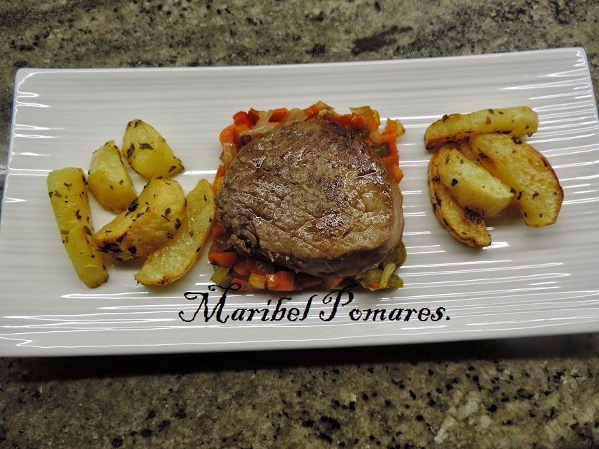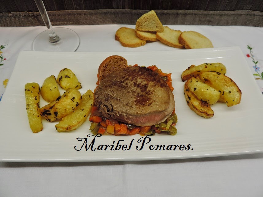 Quitamos el aro de emplatar y ponemos encima el solomillo y al lado las patatas asadas.