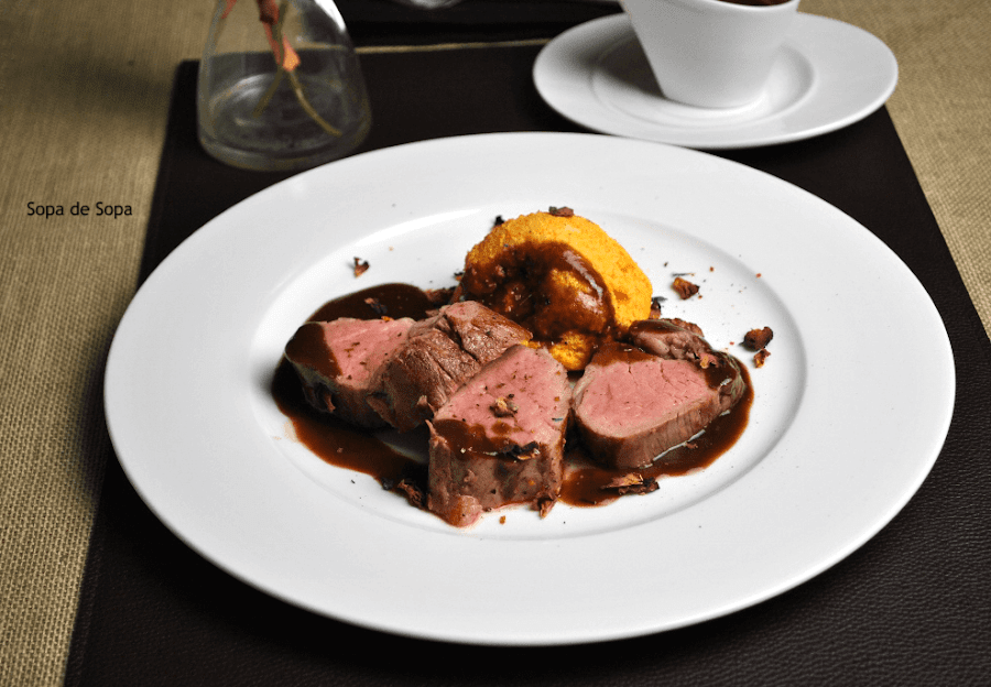 Solomillo de ternera lechal en Sous-Vide, Flan de zanahoria y reducción de vino tinto