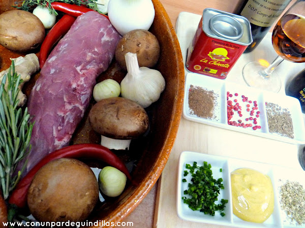 5.- Alrededor del solomillo colocamos los champiñonespicados, los dientes de ajo que nos han sobrado (enteros), el tomillo, el romero, el chile que queda picado fino (con venas y pipas, queremos que pique algo) y las cebollitas francesas.