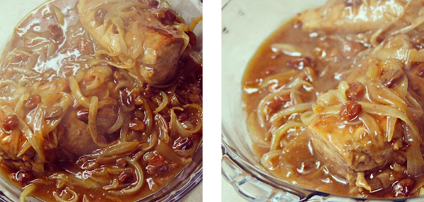 6. Después añadimos a la sartén de la cebolla los solomillos y el vaso de caldo de pollo, el vino y las pasas bien escurridas.