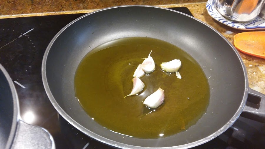 Empezamos poniendo un buen chorro de aceite en una sarten con los dientes de ajo.