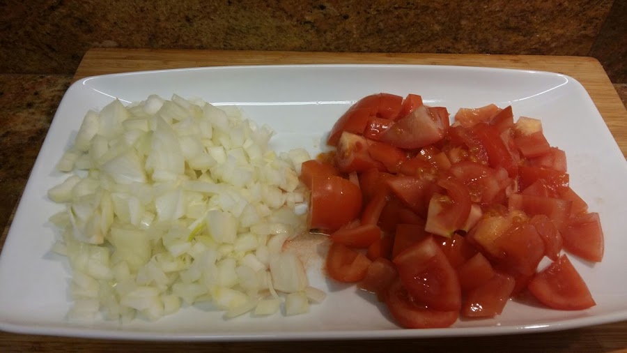 Mientras se evapora el alcohol del vino cortamos en trocitos la cebolla y los tomates.