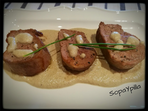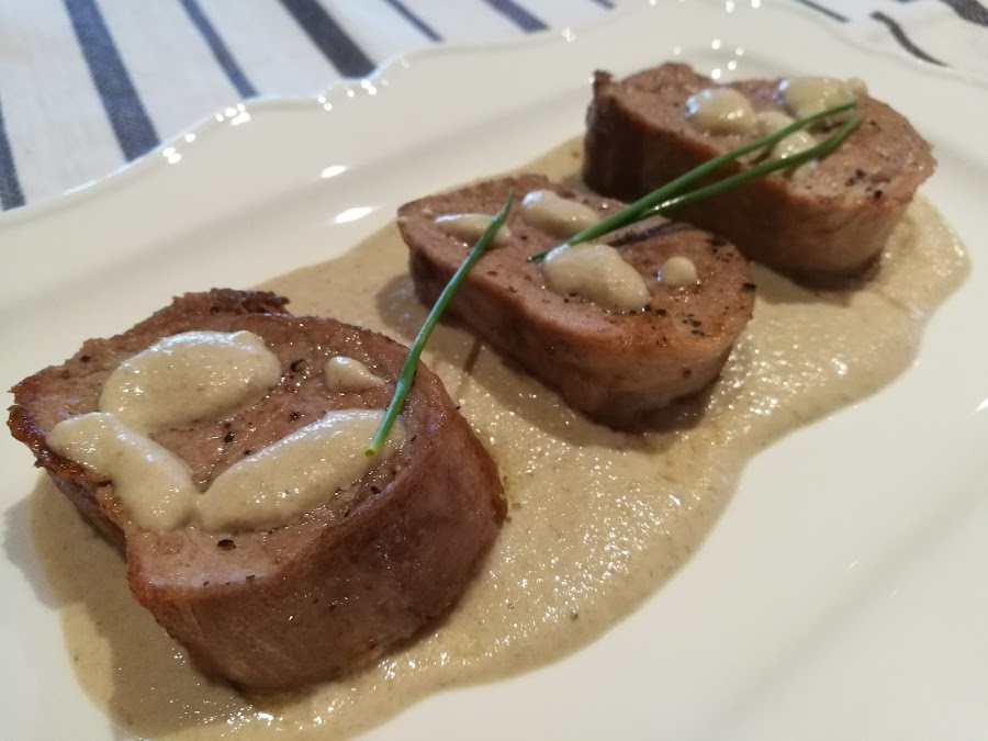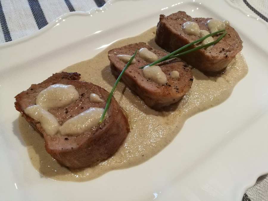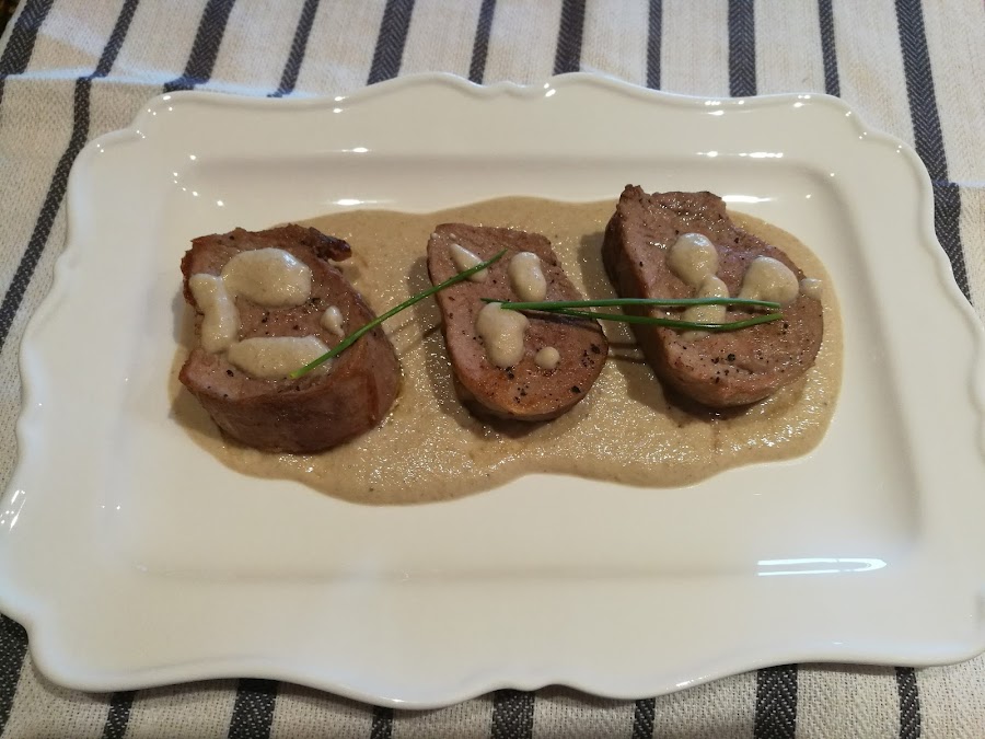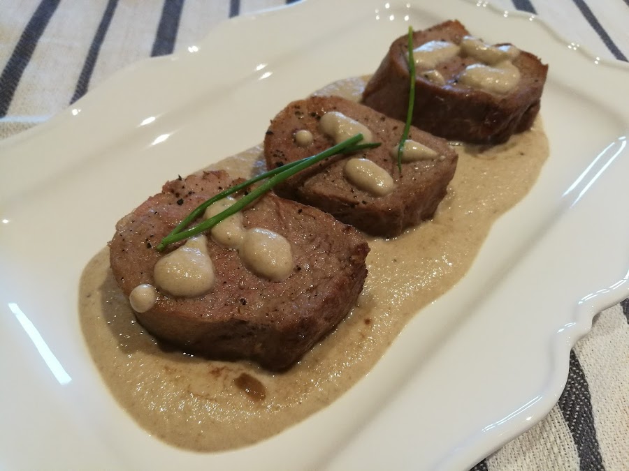 - Añadimos la nata (crema de leche) a los champiñones y de damos un hervor. Paramos el fuego, salpimentamos y trituramos la salsa, y servimos los medallones acompañados de la salsita.