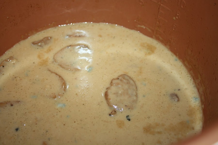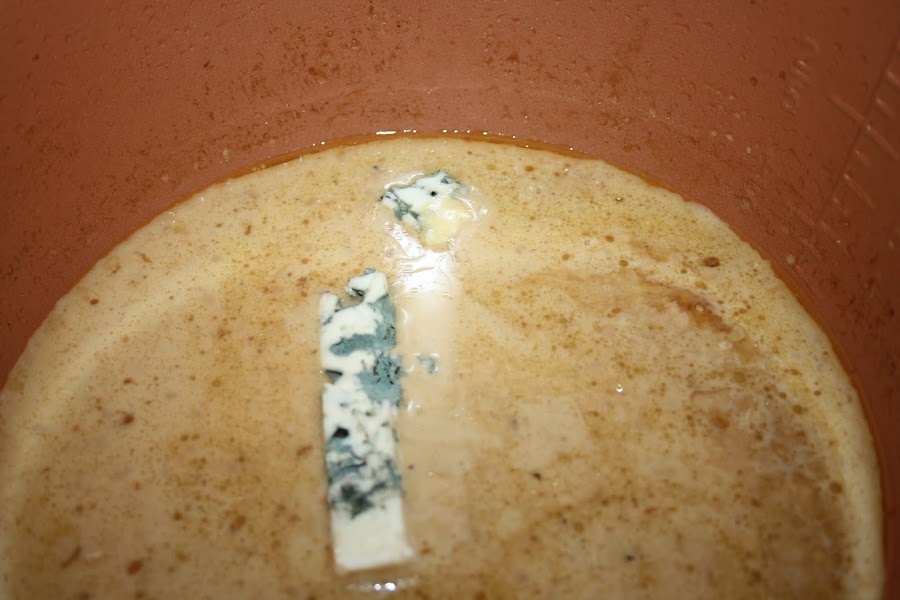 En cuanto pite despresurizamos de manera manual, retiramos la carne, y en menú sofreir a 120º incorporamos la leche evaporada y el trozo de queso roquefort. Dejamos que se disuelva el queso y la salsa espese. Añadimos un poquito de maizena si la queremos más espesa. Introducimos nuevamente la carne en la cubeta y dejamos reposar 5 minutos.