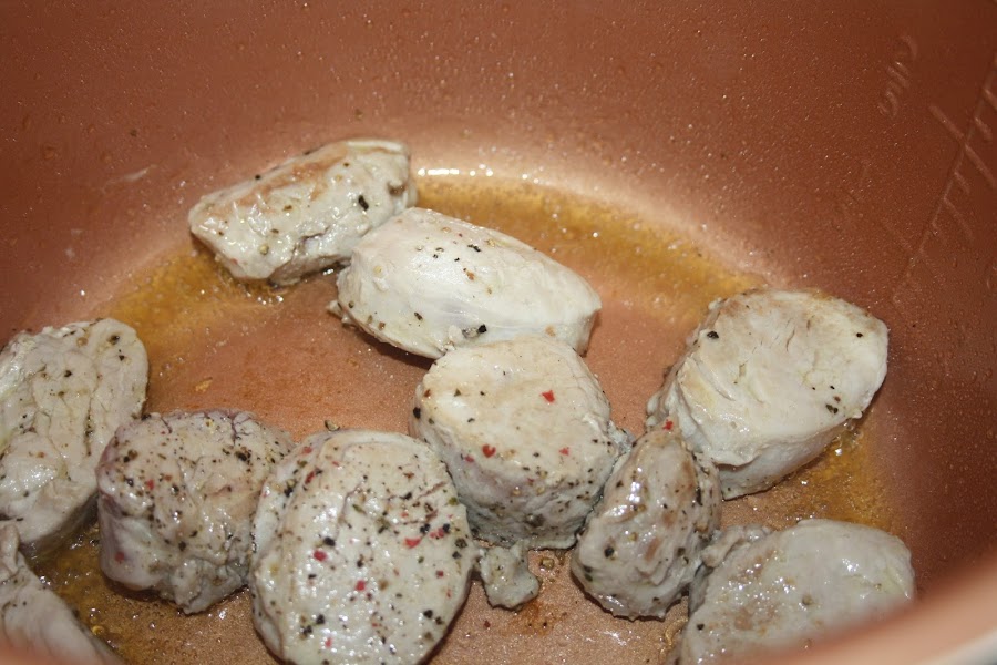 En la cubeta echamos un chorro de aceite, y seleccionamos menú sofreir a 160º. Cuando el aceite esté caliente, añadimos los medallones salpimentados, espolvoreamos ajo en polvo y sellamos. Retiramos y reservamos.