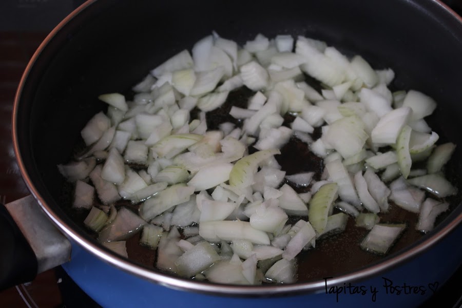 En una cazuela ponemos un fondo de aceite de oliva y pochamos las cebollas picaditas. Dejamos hasta que se doren ligeramente.