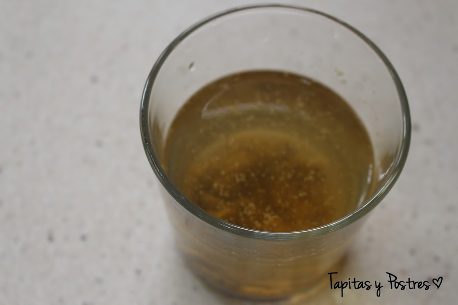 Disolvemos la pastilla de caldo en medio vaso de vino y se lo añadimos a la cebolla pochada.