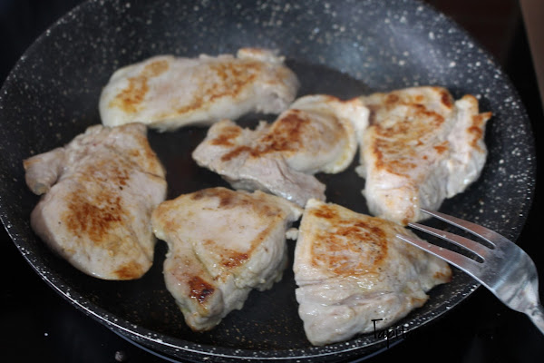 Añadimos los filetes a la salsa de yogur junto con los champiñones y dejaremos cocer durante diez minutos a fuego medio.