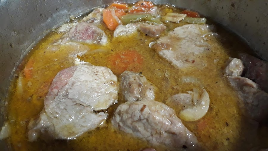 5.- Ponemos encima los medallones de solomillo, añadimos el agua y el vino y salpimentamos.