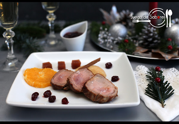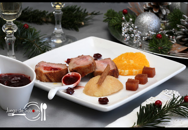 Montar el plato con unas rodajas de naranja, el puré de manzana y unos daditos de dulce de membrillo. Acompañar con la salsa de fresas.