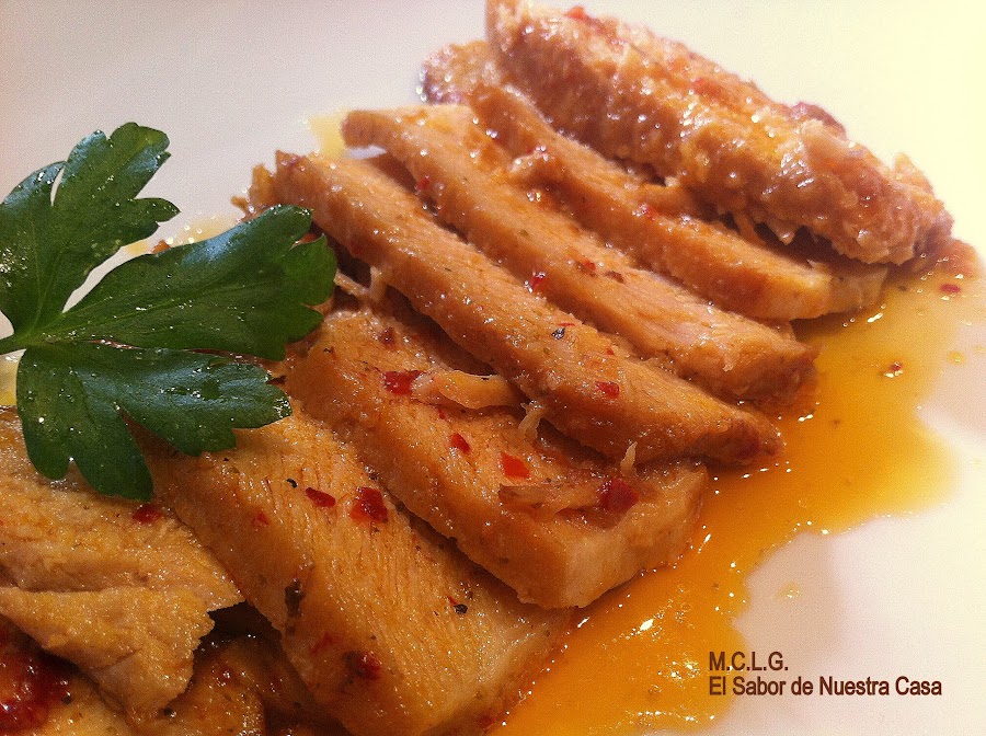 Solomillo de cerdo con pasas y piñones en esta salsa, acompañado de puré de manzana.