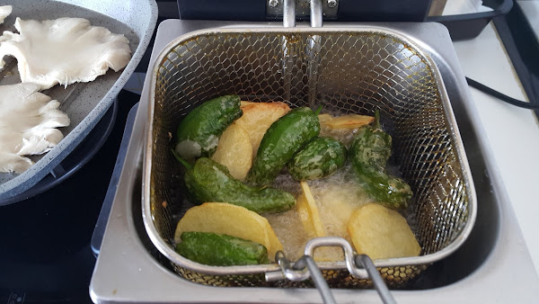 Lo primero que haremos será preparar las patatas. Las pelamos, las cortamos en lonchas y las freímos junto a los pimientos a baja temperatura.
