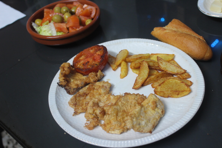 Una vez rebozados los filetes, introducimos en el aceite sobrante un tomate sazonado, partido por la mitad a baja temperatura y tapamos con una tapadera, hasta que el tomate esté tierno, para mojar sopitas en él.