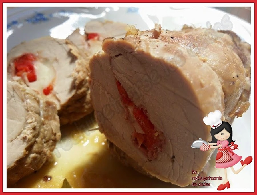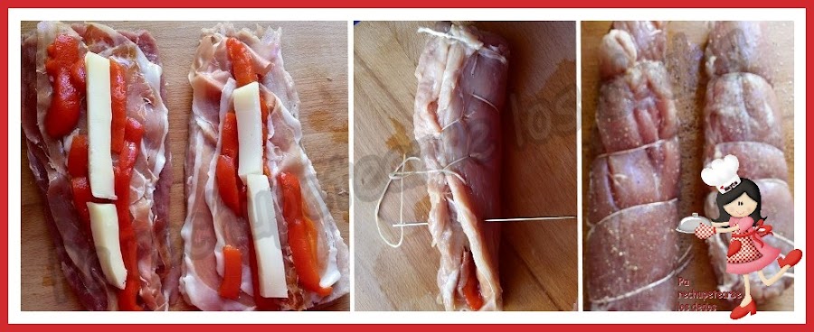 - Rellena con el jamón serrano en lonchas, tiras de pimiento morrón y queso.
