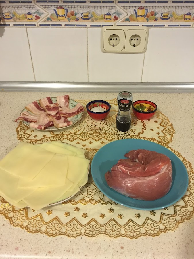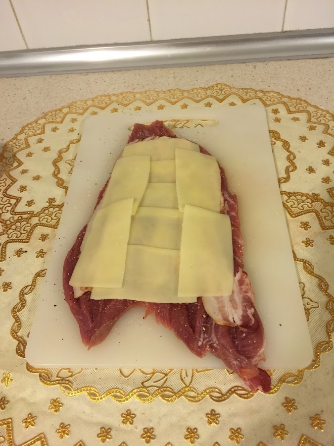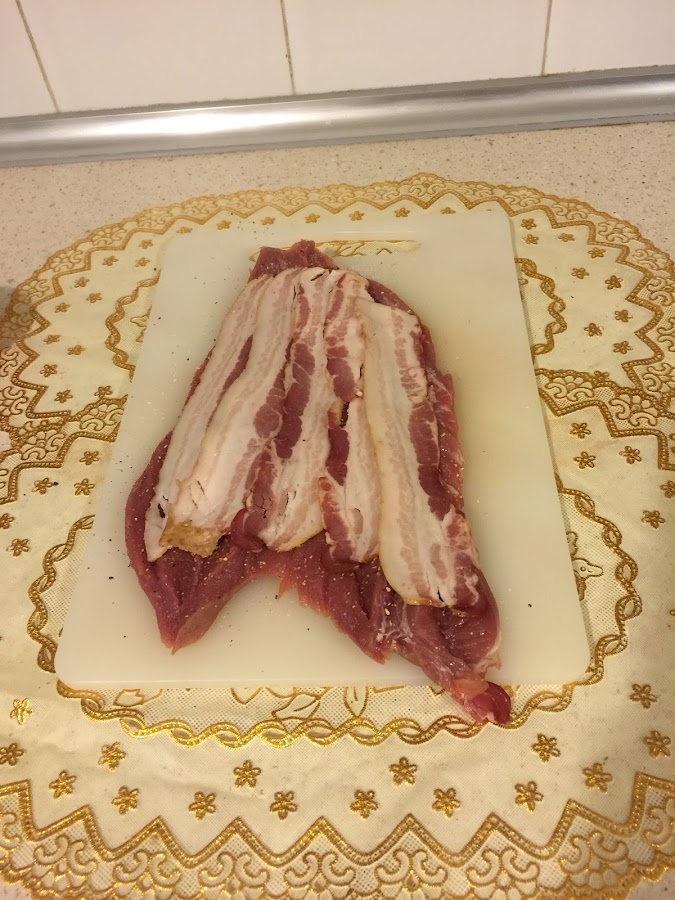 Le agregamos el bacon y el queso y lo enrollamos. Lo atamos con hilo de carnicero o con escarbadientes.