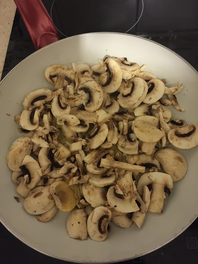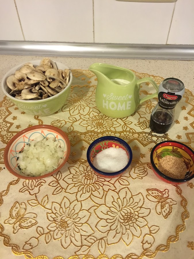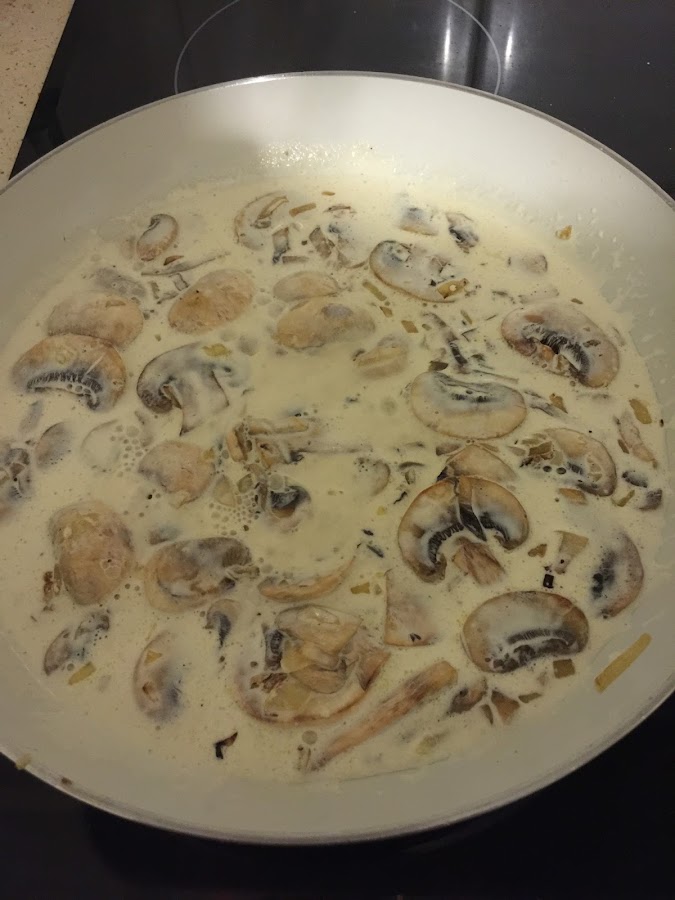Primero vamos a poner a dorar la cebolla con una cucharadita de manteca. Una vez que esta transparente le agregaos los champiñones. Salpimentamos y le agregamos el vasito de vino. Una vez que se evaporo el alcohol le agregamos la crema, bajamos el fuego y dejamos reposar hasta que este listo el solomillo.