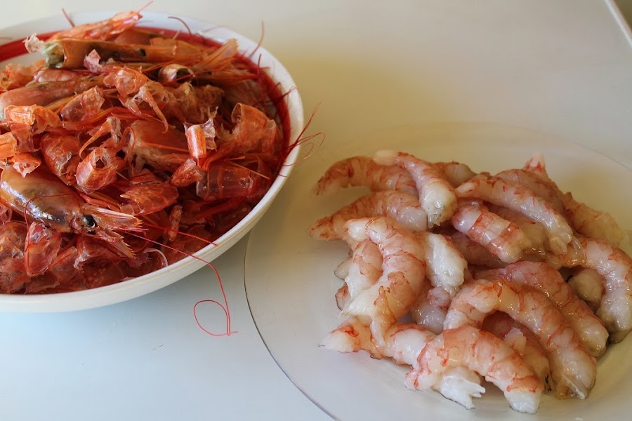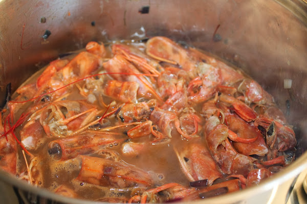 Prepararemos la salsa, dorando la cebolla en una olla, añadiendo las cáscaras y las cabezas de las gambas.