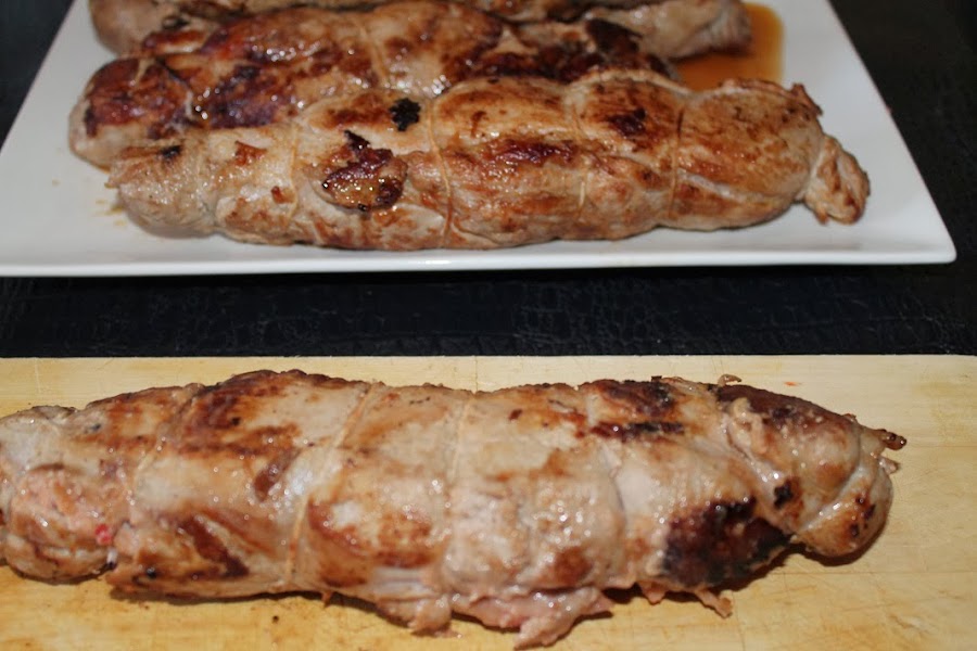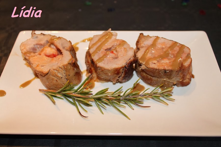 Quitaremos el cordel del solomillo, lo cortaremos en rodajas un poco grandes y serviremos junto a la salsa y una rama de romero