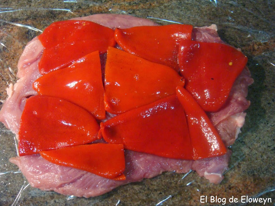 Distribuir los pimientos del piquillo encima del solomillo de forma uniforme.