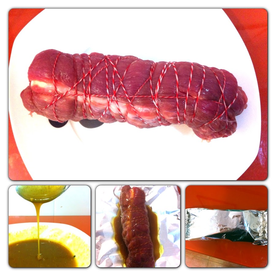 Luego con un pincel, empezamos a pintar con la mezcla el solomillo enrollado por todos los lados (chorreara un poco, pero no os preocupéis que como luego va envuelto con el papel de aluminio se queda ahí toda la sustancia)