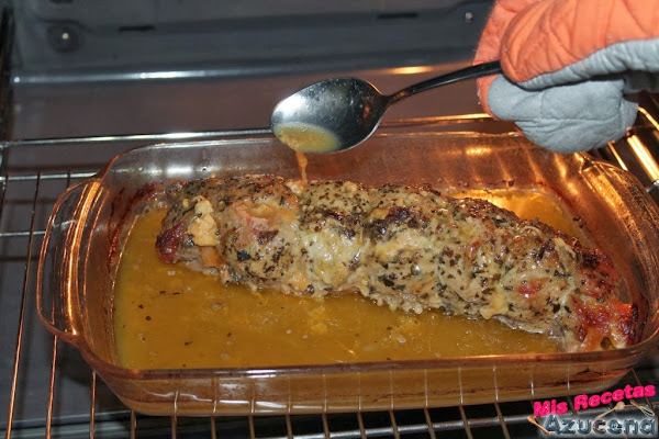 Dejaremos en el horno durante 1 hora y 30 minutos, cuando haya pasado la mitad del tiempo le quitaremos el papel de aluminio e iremos regando con su propio jugo cada 10 minutos.