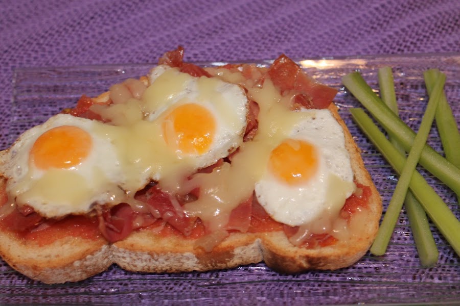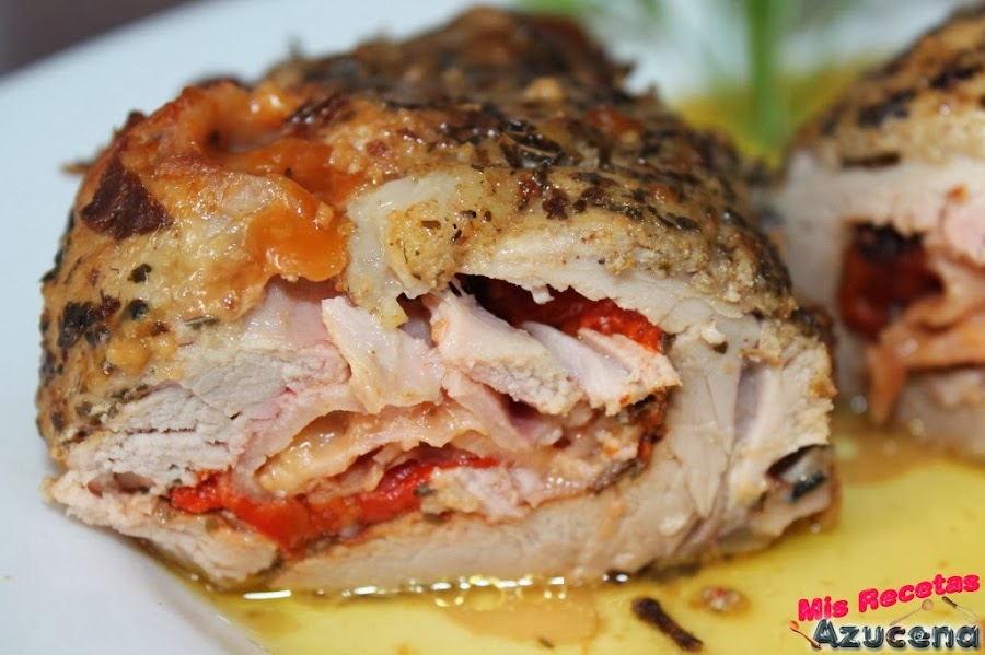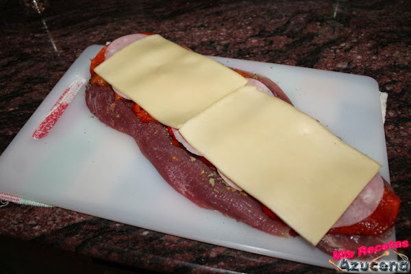 Los pimientos se los tenemos recién asados los pelaremos y los abriremos por la mitad para ponerlos encima de las especias, a continuación pondremos las lonchas de jamón de york y por ultimo pondremos el queso.