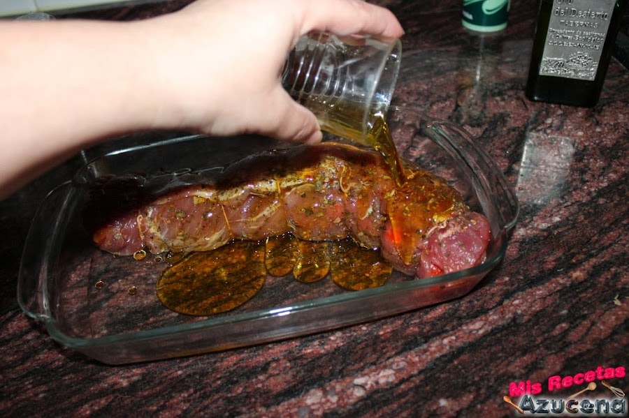 Cuando tengamos el solomillo puesto en la bandeja, añadiremos el vino, el aceite se lo echaremos por encima para que se peguen un poco las especias, tapamos con papel de aluminio y metemos en el horno.