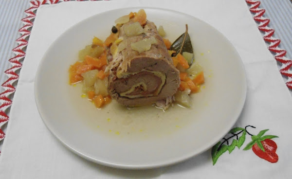 Rellenar el solomillo con el jamón serrano y cocido y con el huevo se hace una tortilla muy fina que se pone encima, se hace un rulo y se ata con hilo de cocina para que no se abra, y se vuelve a pasar por la sarten para que se dore entero.