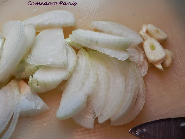 Rehogar en el aceite sobrante de freír la carne la cebolla y el ajo, unos minutos después añadir los champiñones troceados, en este caso al ser enlatados no los he troceado pues eran bien pequeños.