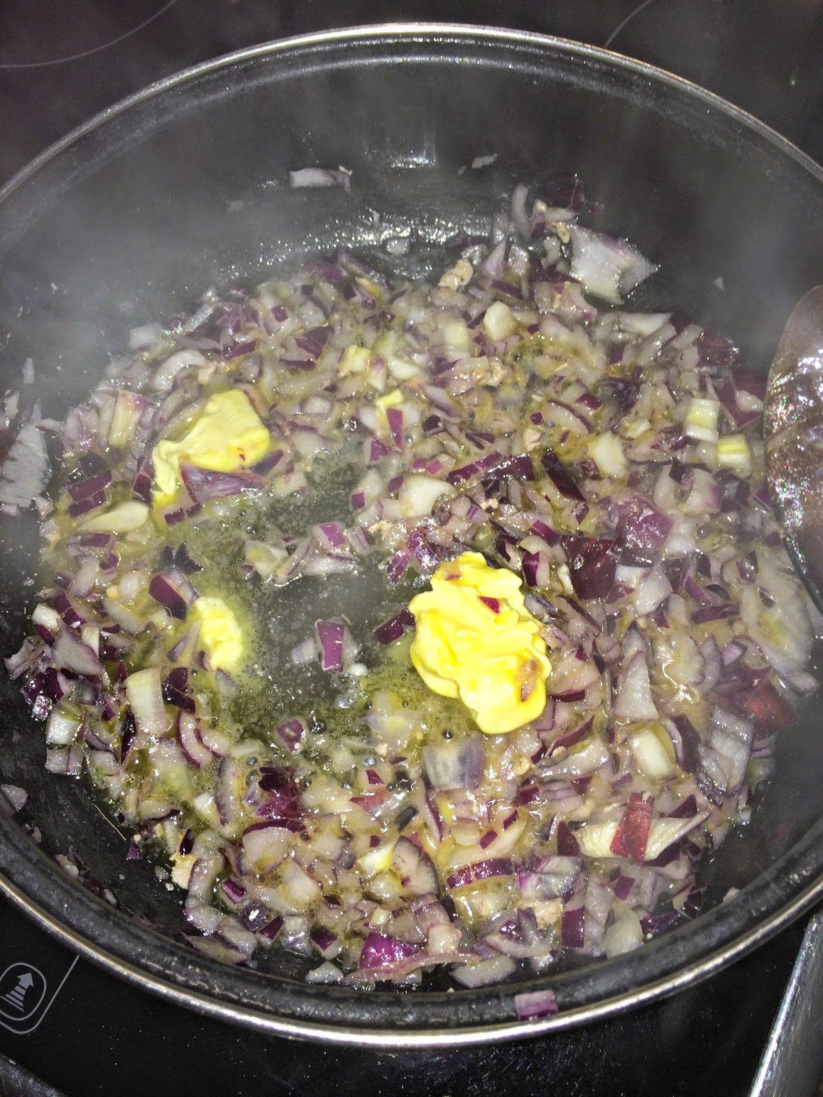 Les damos la vuelta, los sacamos y reservamos. Ahora ponemos el resto de la mantequilla y pocharemos la cebolla, que habremos cortado en brunoise (dados pequeños). Cuando la cebolla este en su punto añadimos un chorro de coñac y lo flambeamos. Acercamos una llama para que prenda el alcohol. Procurad no hacerlo debajo de la campana, o con ésta encendida, ya que puede incendiarse.