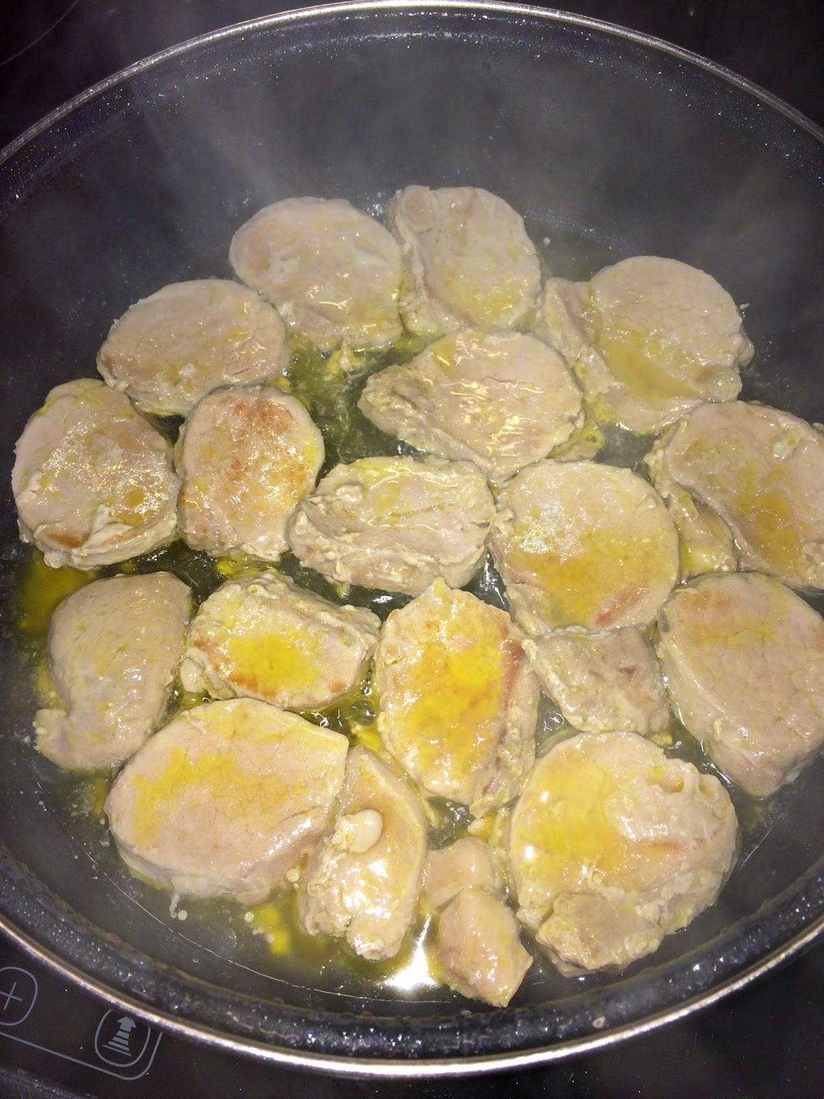 En primer lugar cortaremos el solomillo en rodajas de 1 cm. aproximadamente. En una cacerola pondremos la mitad de la mantequilla y un chorro de aceite para ir salteando la carne. La receta original dice que hay que saltear la carne con mantequilla, pero a mi no me gusta el sabor de la carne solo con la mantequilla, por eso lo mezclo con aceite. Además solo con mantequilla hace que salte mucho y nos pueda quemar.