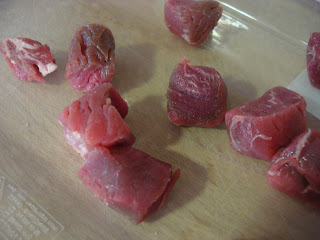Limpiamos el solomillo de grasa, y lo cortamos en tacos.