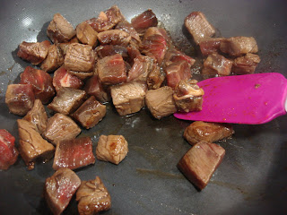 Ahora añadimos otro chorrín de aceite, y salteamos la carne a fuego vivo, no mucho tiempo (prácticamente, vuelta y vuelta).
