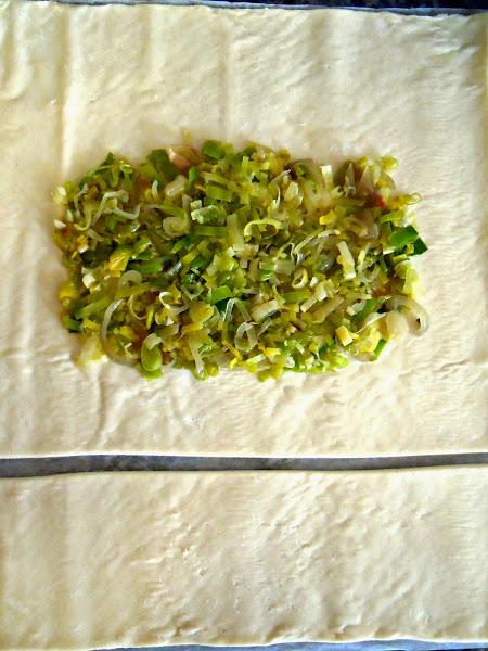 Extendemos una masa de hojaldre y con un corta pizza o cuchillo afilado cortamos un trozo (como en la foto) que nos servirá después para decorar nuestro hojaldre.