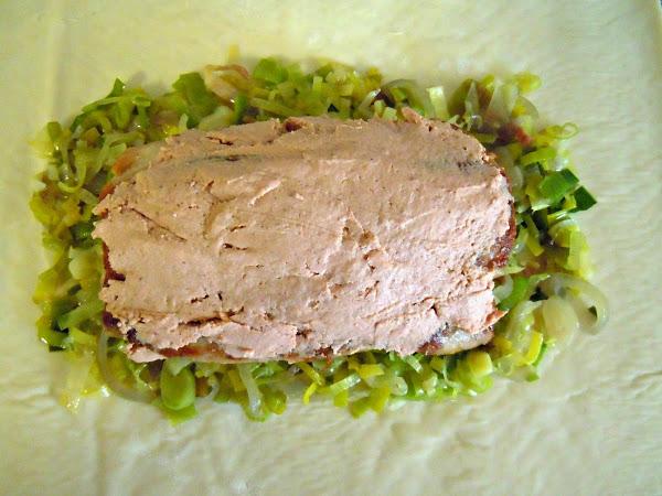 Añadimos la mitad de nuestras verduras y extendemos (ver foto), dejando libre los márgenes para cerrar nuestro solomillo.