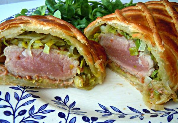 El solomillo Wellington (impone hasta el nombre jajaja) se hace normalmente con solomillo de buey o ternera, duxelles (que es salsa elaborada a base de champiñones, chalotas bien picadas, mostaza y foie gras) y hojaldre.