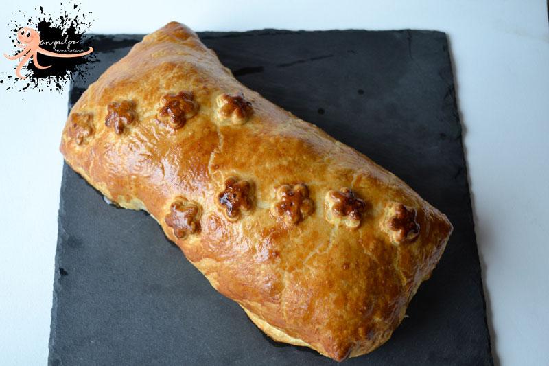 El solomillo Wellington se suele hacer con carne de ternera, pero para que quede bien rico la ternera debe quedar al punto y yo necesito la carne muy hecha, por lo que prefiero hacerlo con solomillo de cerdo que también queda muy rico.