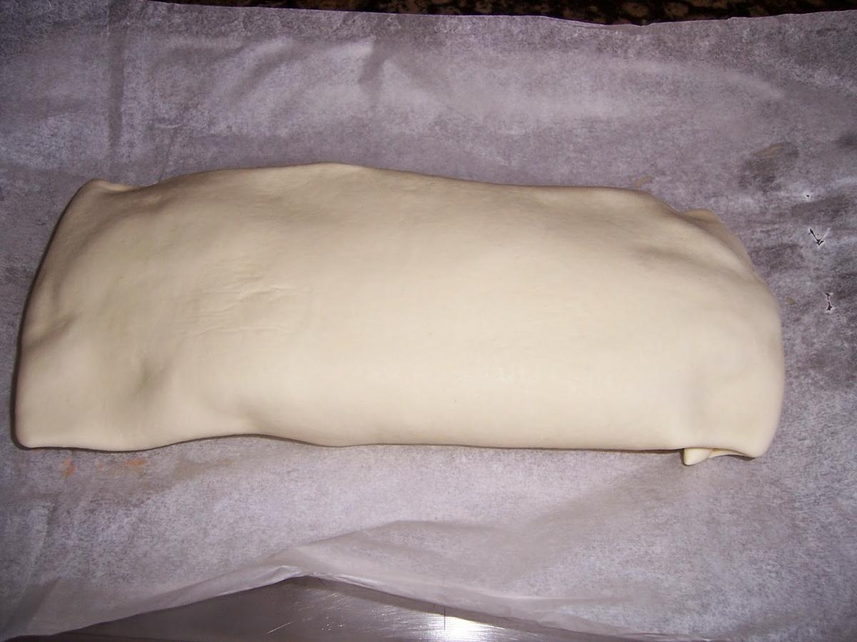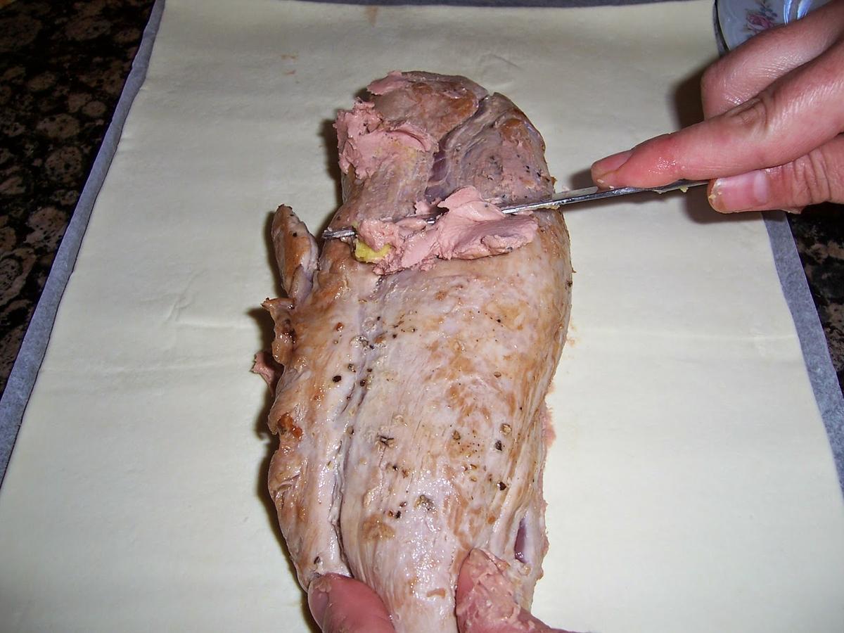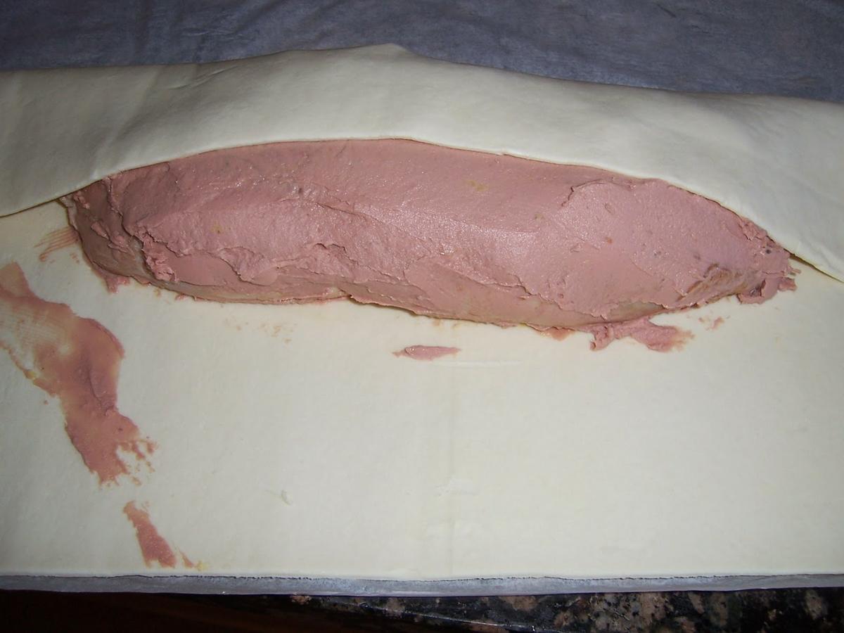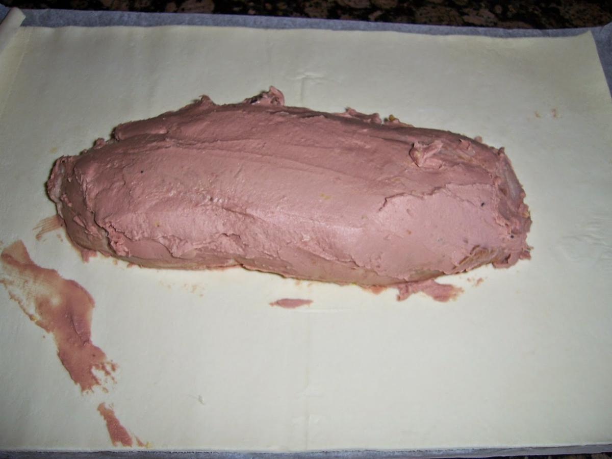 Lo untamos con la mousse de pato y lo envolvemos con el hojaldre, tiene que quedar bien cerrado por todos lados.