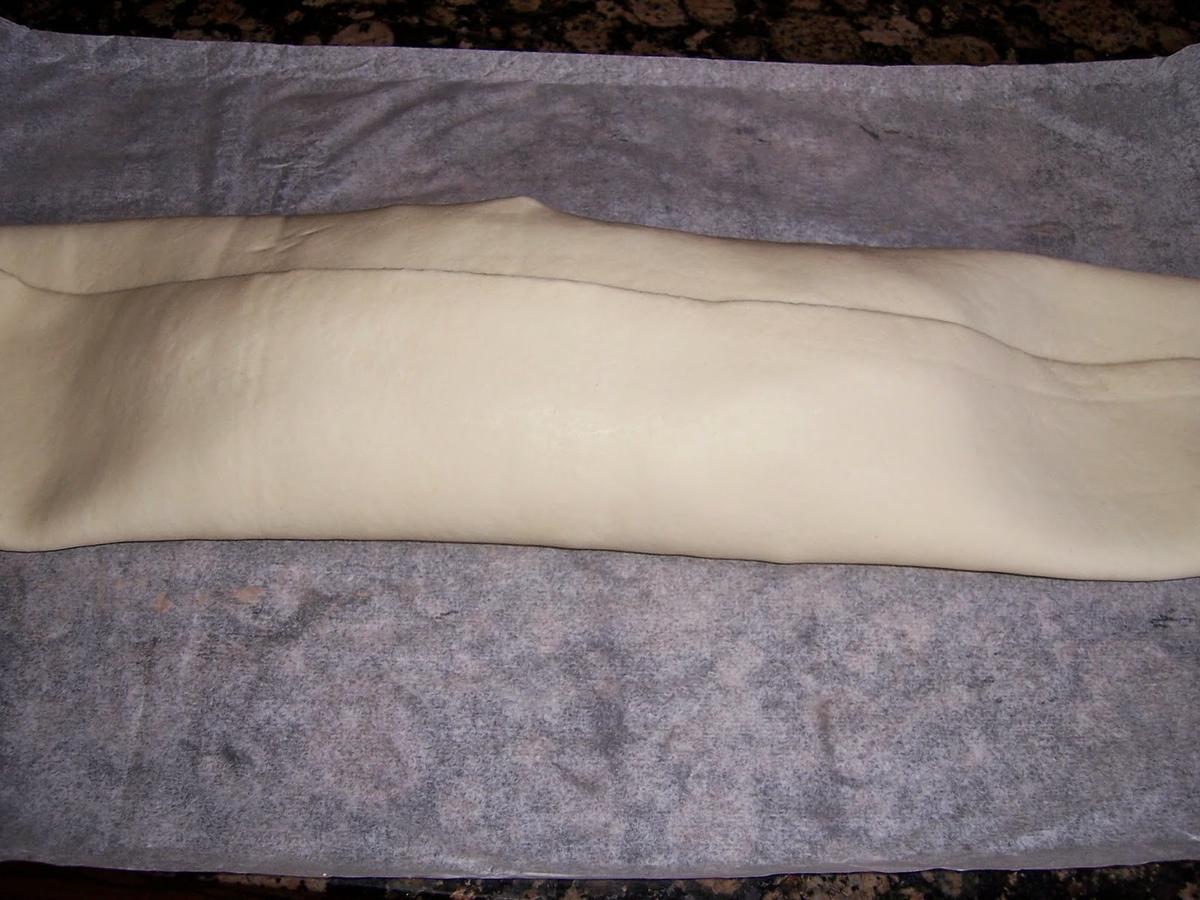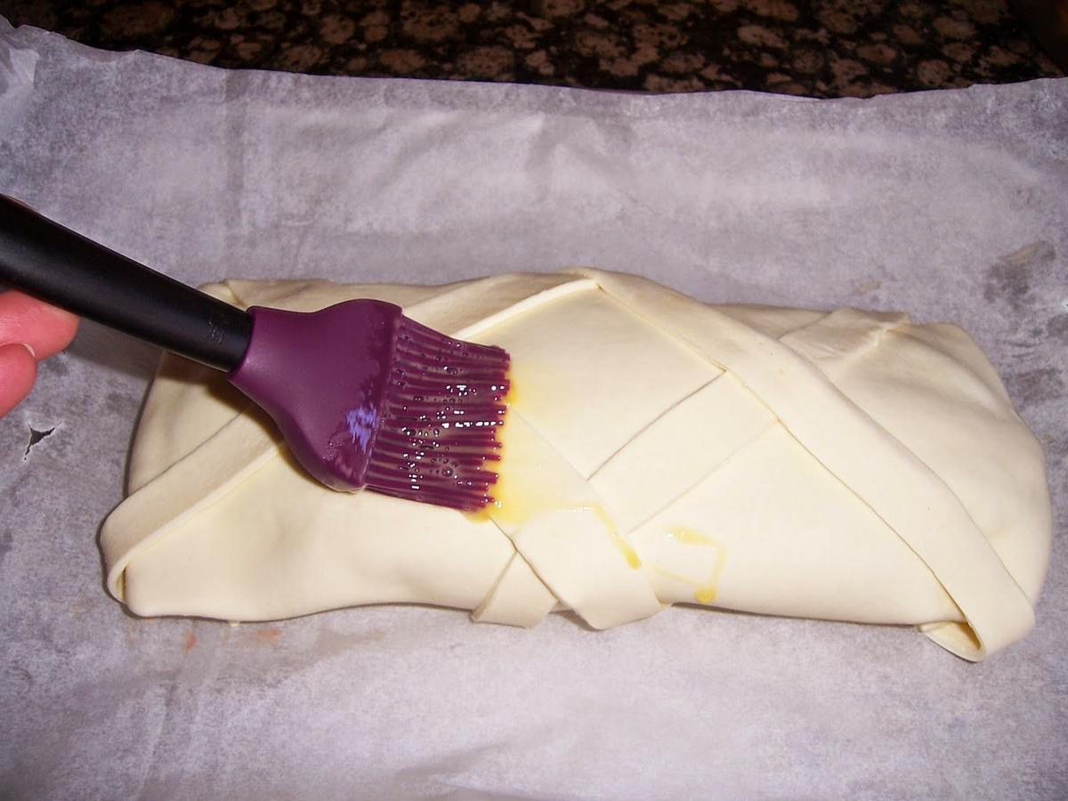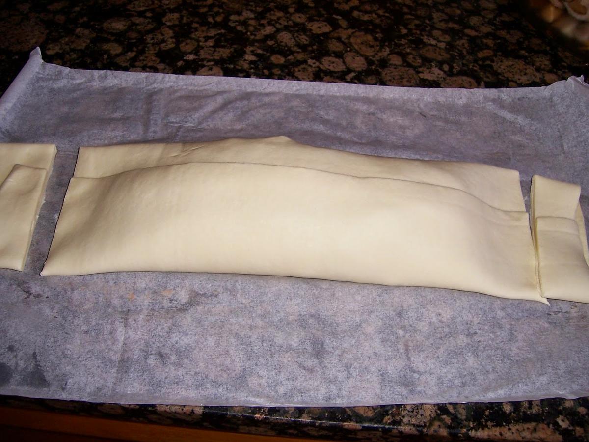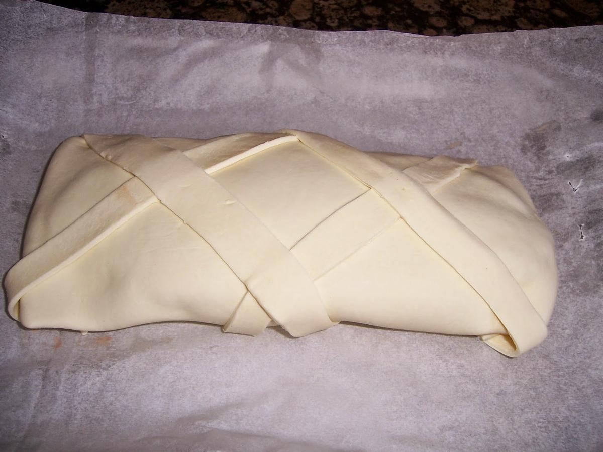 Dejamos los cierres en la parte de abajo, la que da a la bandeja, y la parte bonita hacia arriba, con los recortes del hojaldre hacemos unas tiras y decoramos, pintamos con huevo e introducimos en el horno 20 minutos.