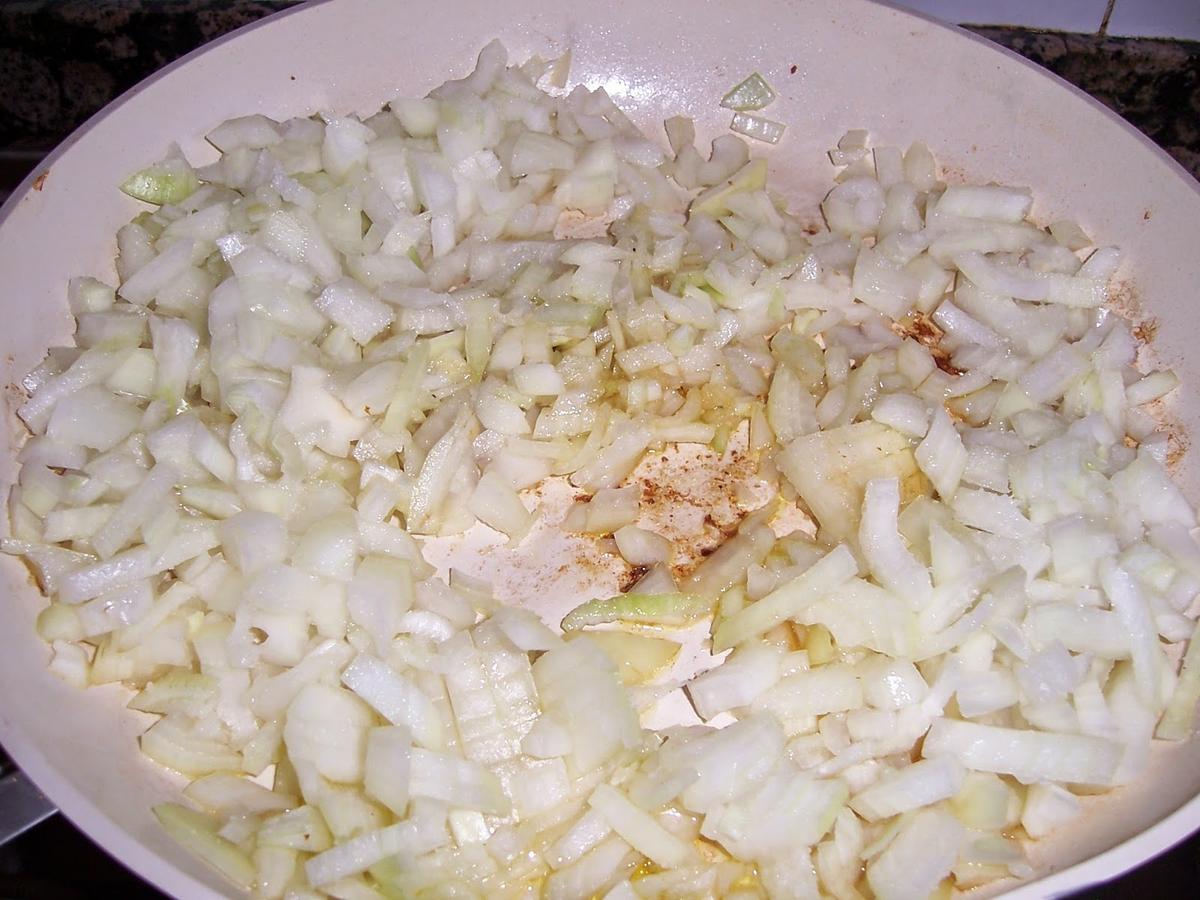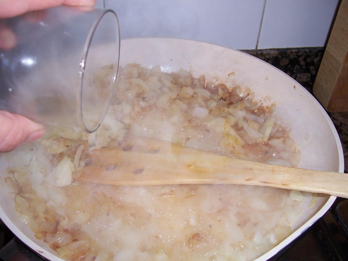 Picamos la cebolla y doramos en una sartén con un buen chorro de aceite de oliva y sal, cuando esté dorándose añadimos el vino y dejamos que se evapore prácticamente todo.