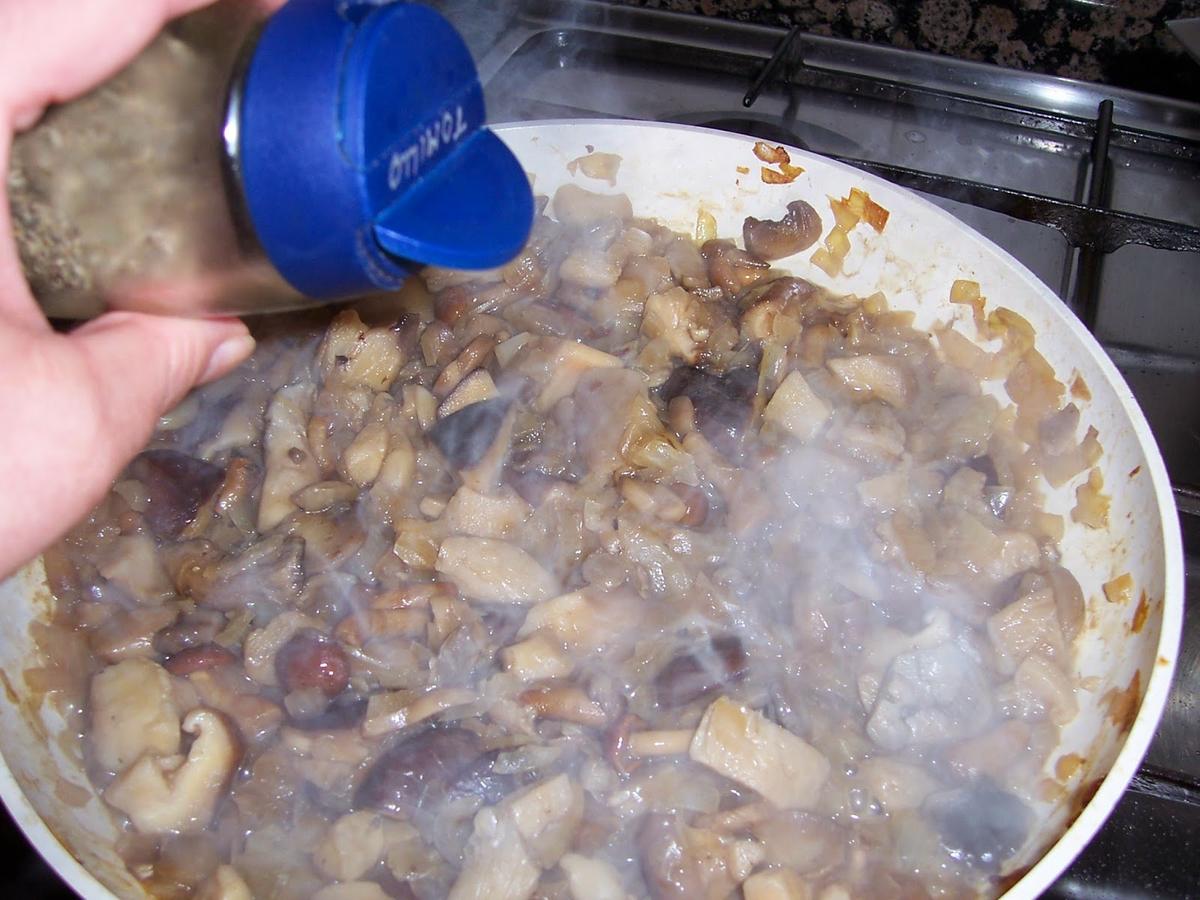 Añadimos las setas y las salteamos hasta que suelten toda el agua, añadimos el Tomillo y listo.