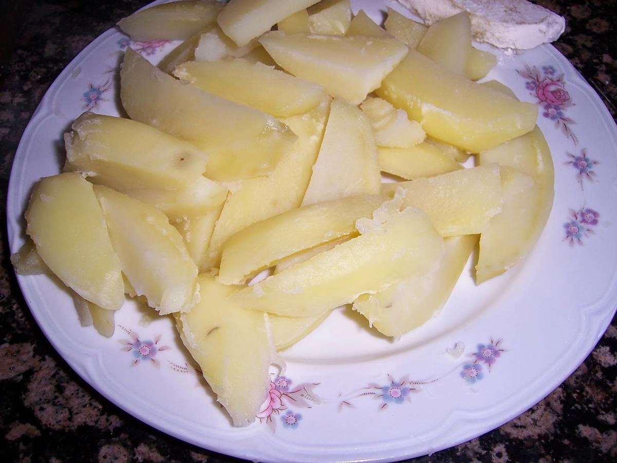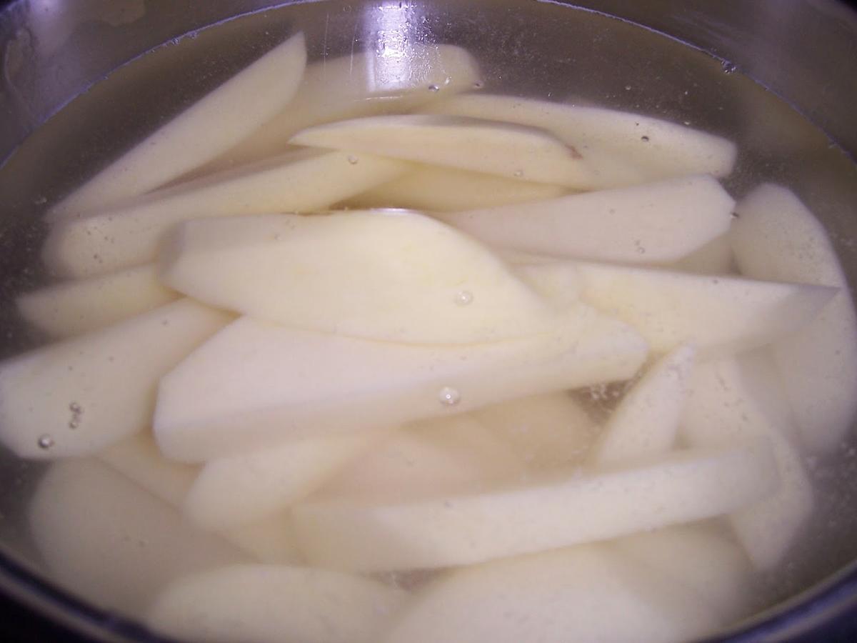 Cortamos las patatas en gajos grandes de unos dos centímetros de ancho y las ponemos en agua, cuando el agua empiece a hervir las dejamos 5 minutos y las retiramos del agua.
