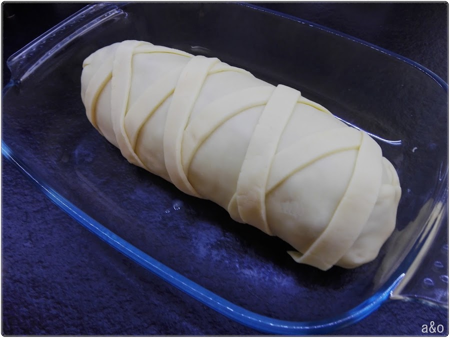 Sexto. Por último, cogemos un huevo batido y pintamos el solomillo. Además, le haremos unos agujeros al hojaldre para que este no quede abombado. En mi caso, lo he hecho en los laterales de las líneas, de esta forma, no se aprecian al ojo humano, pero están ahí. Finalmente, espolvoreamos un poco de sal gorda o escamada por encima.
