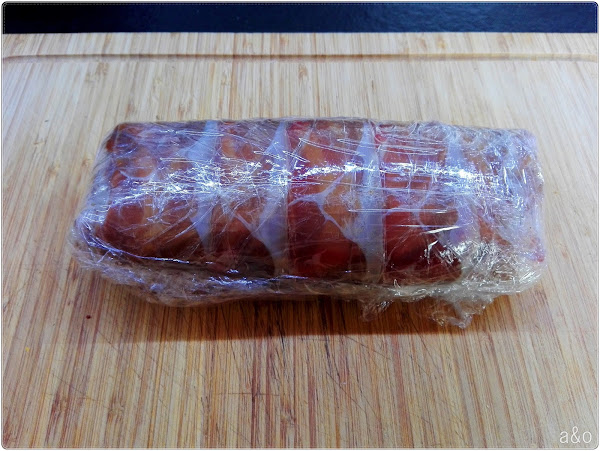 Cuarto. A continuación, posamos el trozo de solomillo en uno de los extremos y lo vamos envolviendo, ayudándonos del film transparente. Una vez hecho, lo metemos en el nevera durante unos 15 minutos para que se termine de pegar bien.