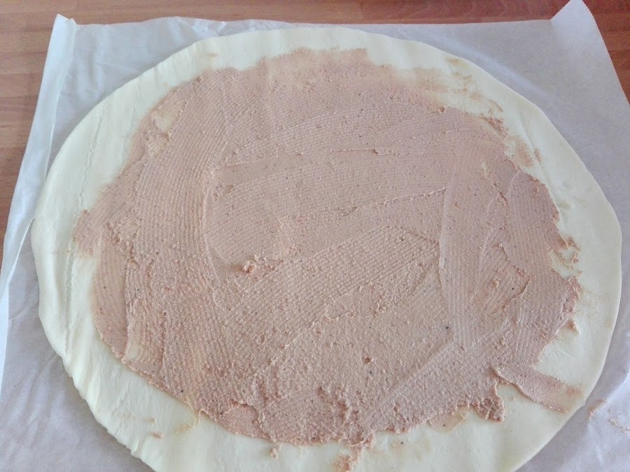 Untamos el paté por toda la lámina de hojaldre dejando un margen en los bordes para trabajar con más comodidad a la hora de cerrarlo