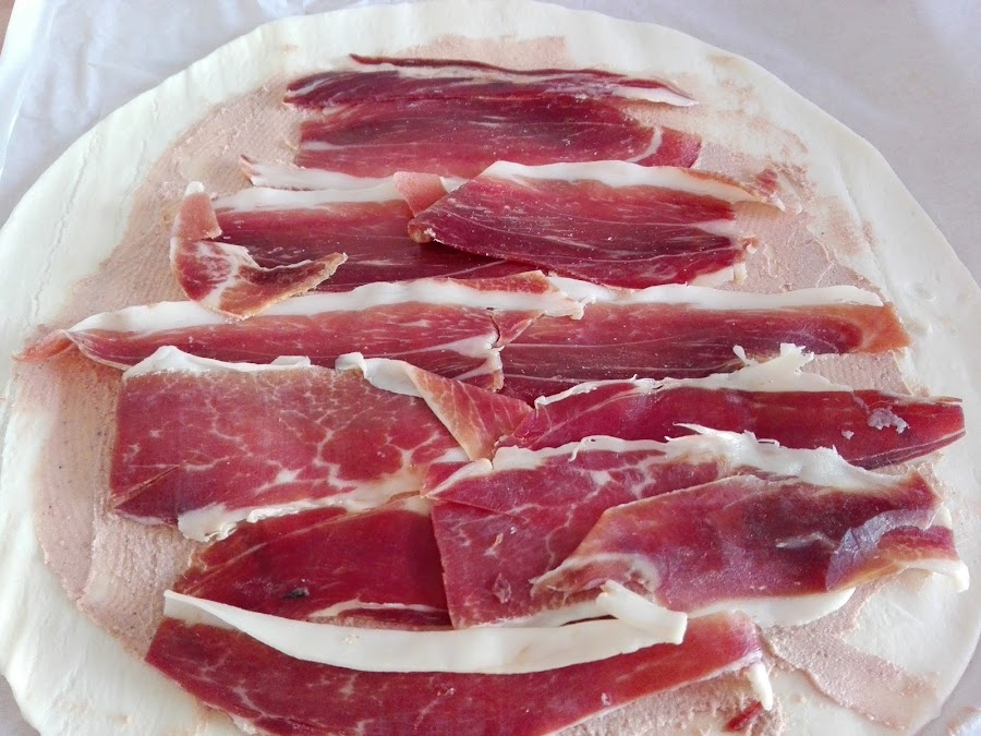 Ponemos el jamón serrano encima del paté cubriendo bien toda la superficie y colocaremos encima el solomillo que hemos sellado previamente en la sarten.