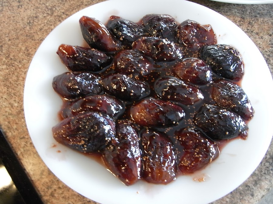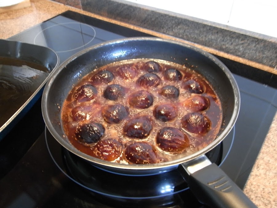 Se pone una sartén al fuego con 1 cucharada de mantequilla y 2 de aceite. Se ponen los higos con la parte plana hacia abajo y se dejan unos minutos hasta que se marcan un poco, después se les da la vuelta con cuidado y se echa el vino. Se deja cocer 5 minutos y se les vuelve a dar la vuelta.