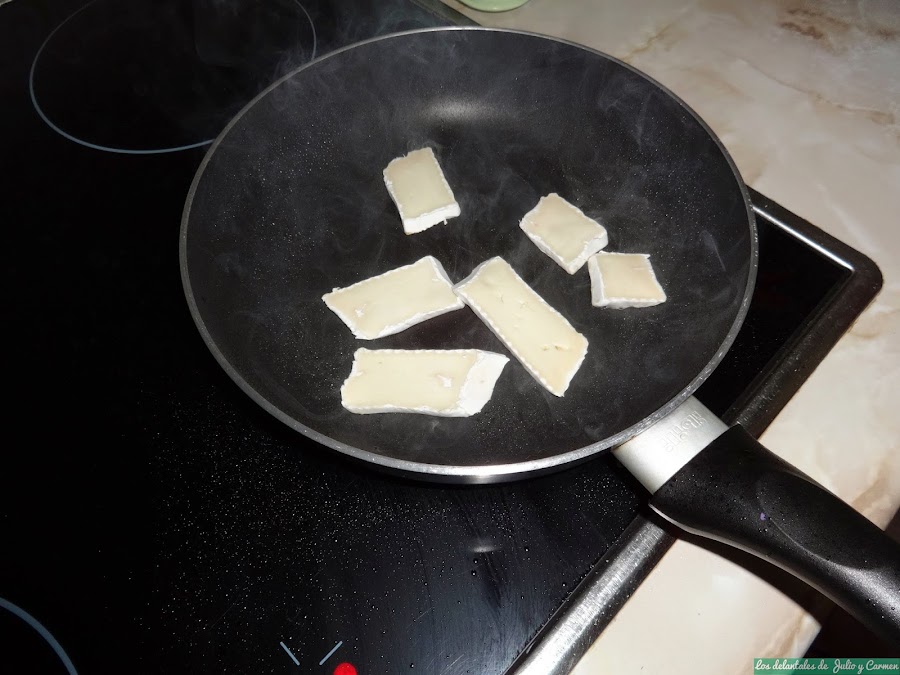 En la misma sarten, y sin necesidad de echar mas aceite, pondremos los trozos de queso, dejándolos dorarse unos segundos. No hay que tenerlos demasiado tiempo, ya que se nos comenzarán a derretir. Sacamos y pondremos encima de cada solomillo, un trozo de queso.