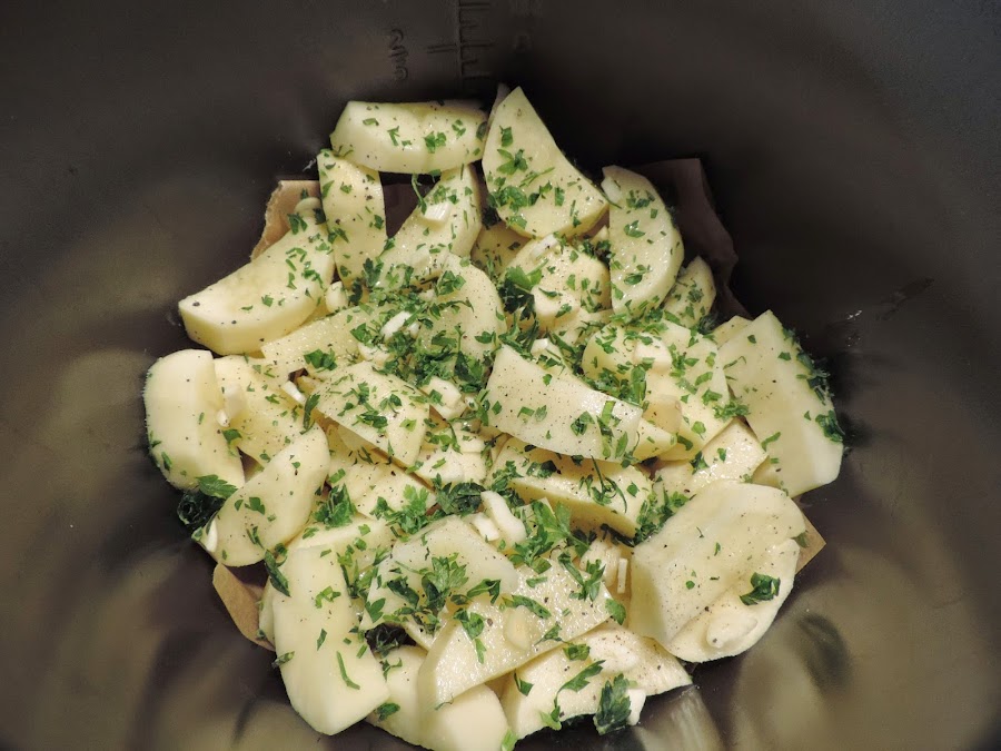 Las ponemos en la cubeta de la olla con los ajos fileteados, perejil picado, sal, pimienta y el aceite de oliva.